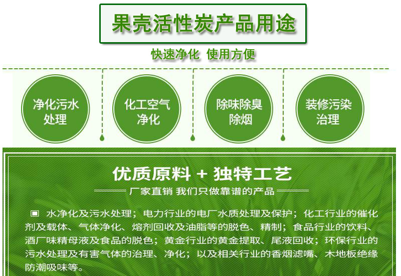 水处理应用:产品采用优质果壳、椰壳为原料,广泛应用于饮用水、生活用水,饮料用水、自来水厂、电厂锅炉用水、工业纯水净化,也用于各种工业废水的净化、提纯等,可有效去除水中的有机物、异味、余氯、酚、汞、铁、铅、砷、铬、硅胶、氰化物等有害物质及有效除嗅去色。