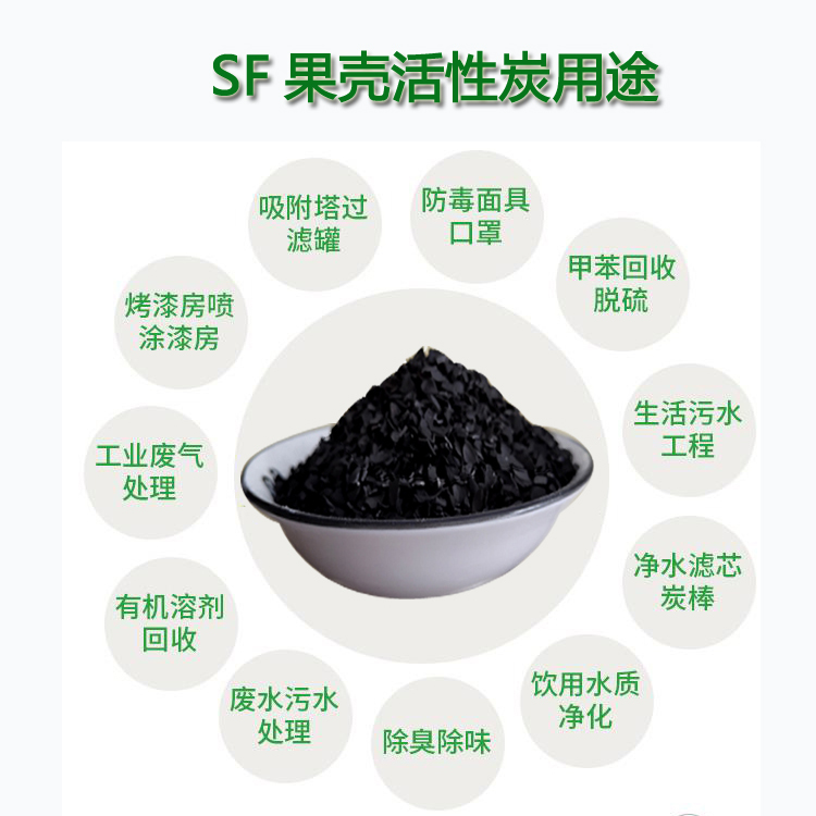 废气处理领域:产品采用优质果壳为原料,空隙结构合理,广泛用于有毒气体的净化,废气处理,漆雾吸附等。对于化工、石化、炼焦、环保等行业的气体处理及对SO2、氯苯、辛烷、乙胺、二甲基苯、环已烷、甲醚、嗅化氢、二氧化硫、二硫化硒碳、氯乙烯、甲醇、丙酮、氧化氮等工业有害气体的净化处理。